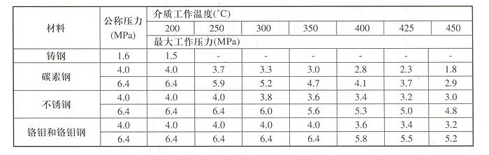 調(diào)節(jié)閥、管子及管路附件的公稱壓力、工作壓力、使用溫度的關(guān)系見表一